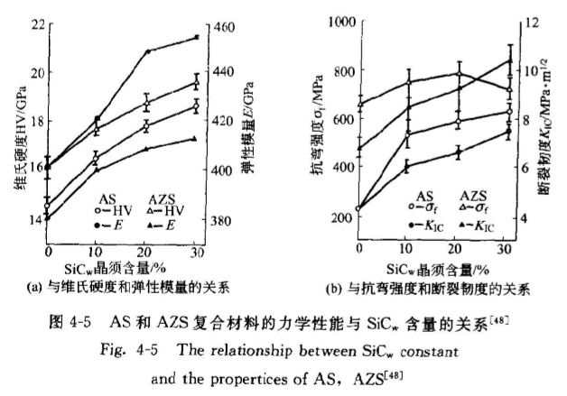 將兩種粉料分別配成分散良好的懸浮液,將兩種分散液混合,用瑪瑙球在QGM3-1輕型罐磨機聚氨酯磨罐中濕磨22h?;旌玫臐{料用無水乙醇清洗3遍,然后在氮氣氣氛中0.93MPa下熱壓燒結(jié),1650℃中保溫半小時?。周玉等人的制備工藝與之相似,試樣有AS和AZS材料,AZS材料中含有20%(體積分?jǐn)?shù))2Y-ZrO2,AS材料中隨SiC含量從0增加到30%(體積分?jǐn)?shù))[4圖4-5表明,AS材料的抗彎強度隨SiCw含量的增加而不斷提高,而且最初加入的10%(體積分?jǐn)?shù))SiC、強化效果最為顯著而后增長緩慢慢。