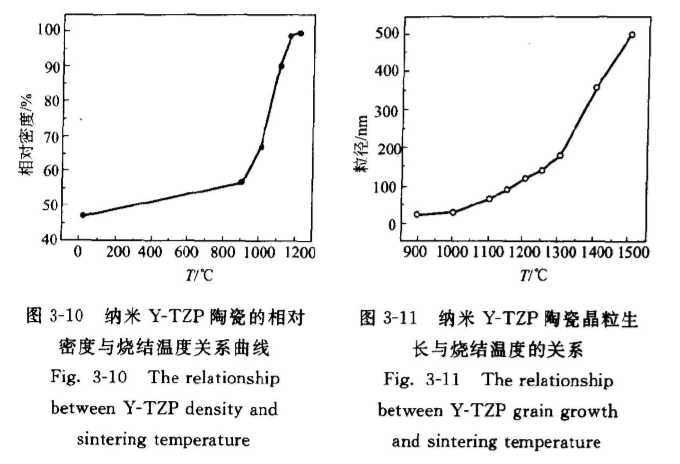 較圖3-10和圖3-11可知,在1150℃時(shí)可獲得燒結(jié)相對(duì)密度達(dá)97.5%,晶粒大小僅90nm左右的納米YTZP材料。