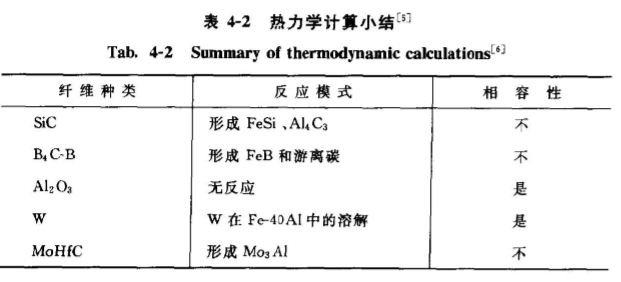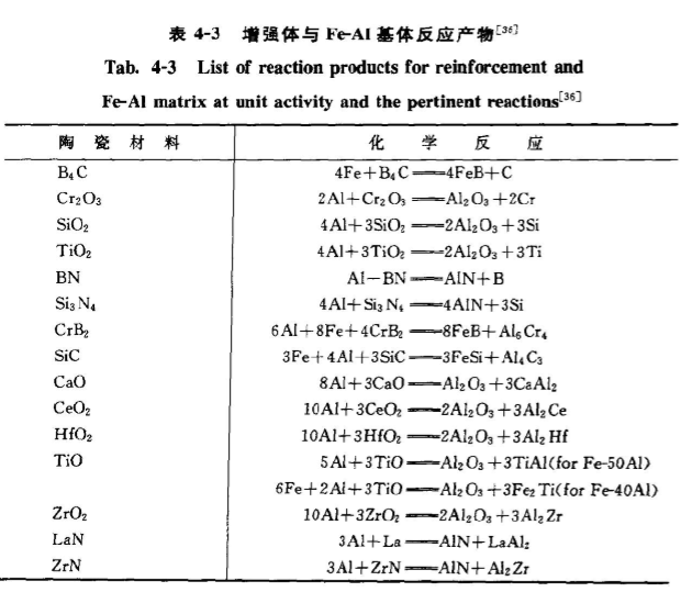 由表4-2可以看出,F(xiàn)eAI與A2O具有較好的適配性能,兩者之間無界面相形成。AAYK. MISRAZ在1990年也分析預(yù)測了以FeAl金屬間化合物為基體,陶瓷為增強(qiáng)體復(fù)合村料的熱動力學(xué)可能反應(yīng)產(chǎn)物),分析結(jié)果見表4-3。上述結(jié)果對復(fù)合材料的設(shè)計(jì)也是非常重要的。