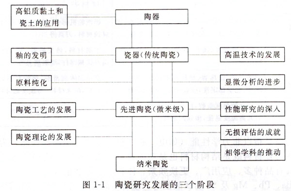 總的來說,陶瓷是一種既古老而又年輕的_:程材料,陶瓷材料的發(fā)展經(jīng)歷了從陶瓷發(fā)曩裂瓷器.從傳統(tǒng)陶瓷發(fā)展到先進陶瓷,從先進陶瓷發(fā)展到納米陶瓷三次重大飛躍(見圖I-I),而這三次飛躍只是中華文明史的一個縮影。