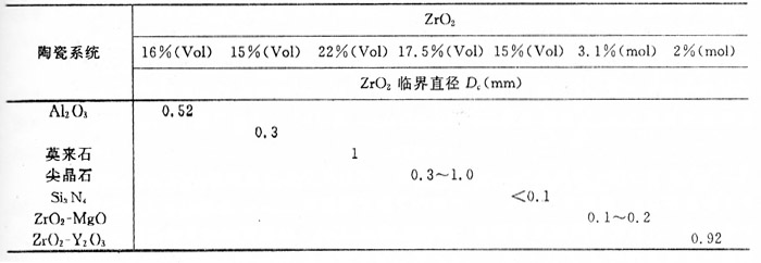表2-1-9列出了在室溫條件下,不同陶瓷基體中的氧化鋯相變臨界顆粒直徑D。